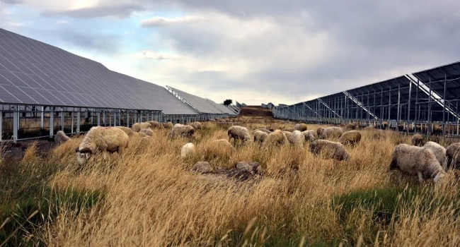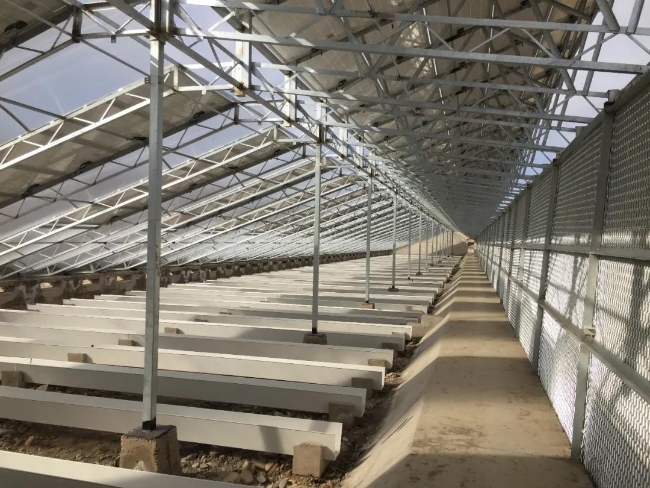 該工程采用牧光互補(bǔ)設(shè)計(jì)方案,上部光伏組件發(fā)電,下部養(yǎng)殖牛、羊,光伏棚間種植牛羊草料。裝機(jī)容量為49.75兆瓦,光伏組件計(jì)184272塊,并網(wǎng)逆變器72臺(tái)。設(shè)計(jì)將光伏與農(nóng)業(yè)結(jié)合為一體,多種經(jīng)濟(jì)模式并存,實(shí)現(xiàn)經(jīng)濟(jì)效益最大化,為光伏行業(yè)提供新的發(fā)展模式。