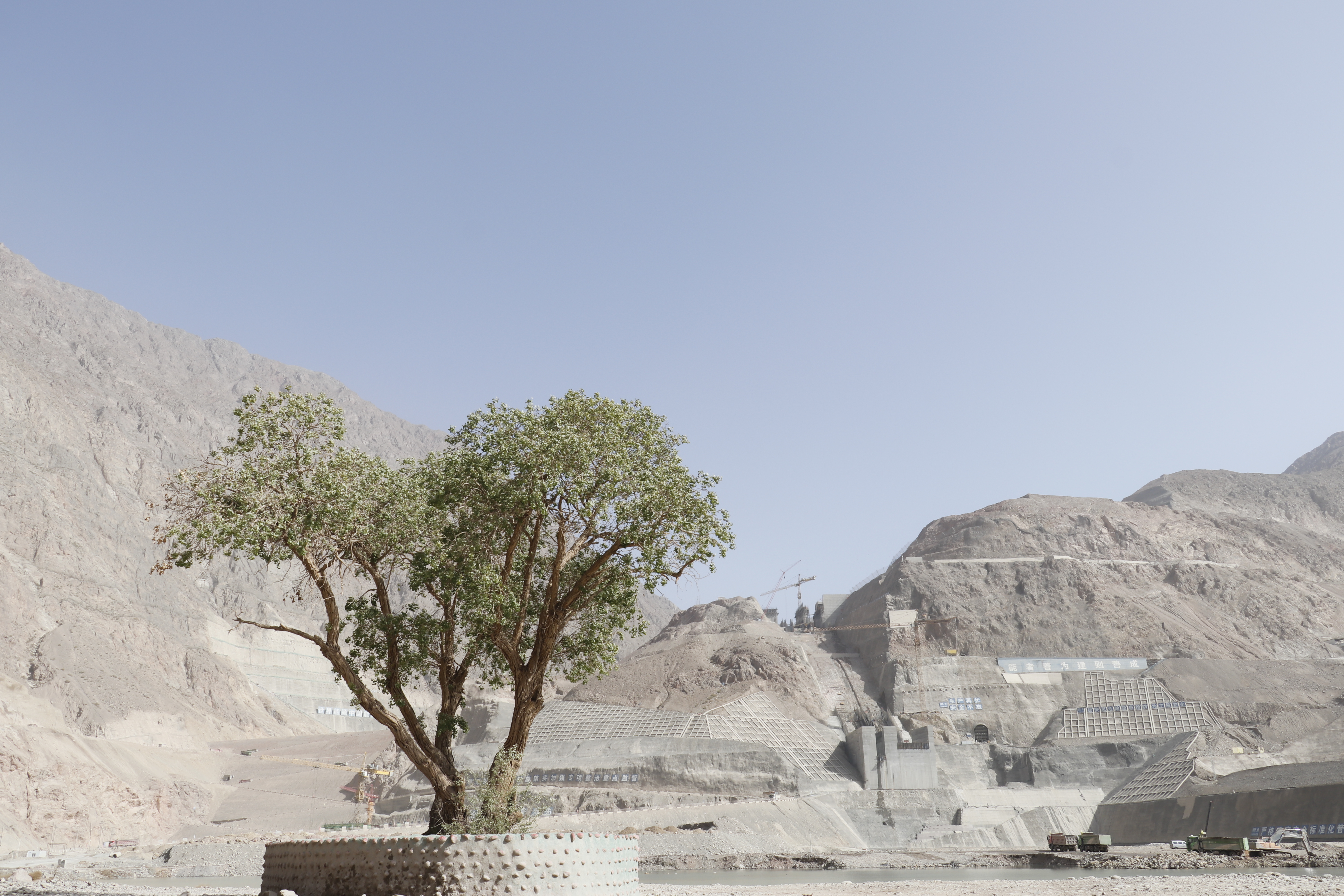 在工程導(dǎo)流洞出口前的河岸邊,幾棵生長百年的原生胡楊樹,日復(fù)一日見證著大壩的穩(wěn)步增高。現(xiàn)在,建設(shè)者們?yōu)楹鷹顦湫奁鹆吮Wo(hù)墻,在奮力筑牢大國重器中等待著春暖樹綠。