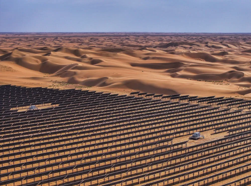 這是2025年6月5日拍攝的位于內(nèi)蒙古巴彥淖爾市磴口縣的烏蘭布和東北部新能源基地100萬千瓦光伏先導(dǎo)工程項(xiàng)目(無人機(jī)照片)。該項(xiàng)目地處烏蘭布和沙漠。新華社記者 連振 攝